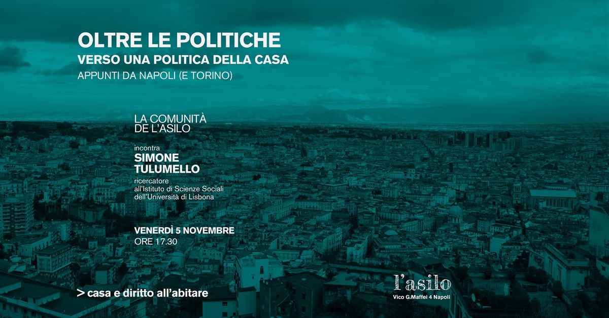 Casa e diritto all’abitare sono temi cardinali sia per comprendere la trasformazione del tessuto urbano contemporaneo, sia per tracciare possibili rotte alternative ai processi di turistificazione e gentrificazione. La comunità dell’Asilo ne parla, venerdì 5 novembre dalle ore 17.30, con Simone Tulumello, ricercatore all’Istituto di Scienze Sociali dell’Università di Lisbona. Simone restituirà, in una discussione collettiva, i risultati delle sue recenti ricerche su Napoli e Torino in merito ai temi dell’abitare, delle politiche della casa e delle trasformazioni urbane.